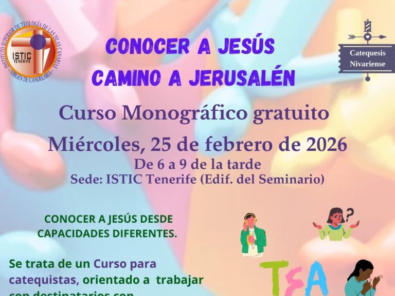 El miércoles 25 de febrero de 2026, en el ISTIC de Tenerife, celebrarmos un curso monográfico gratuito para los catequistas, en el que, junto a un grupo de especialistas, intentamos acercarnos a la realidad de las personas con TEA que participan en nuestra catequesis.