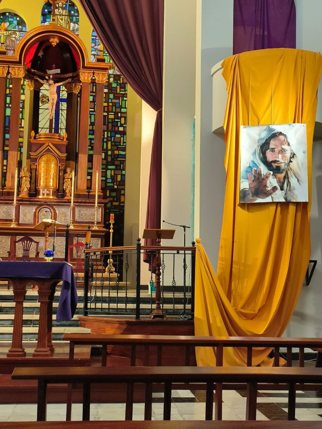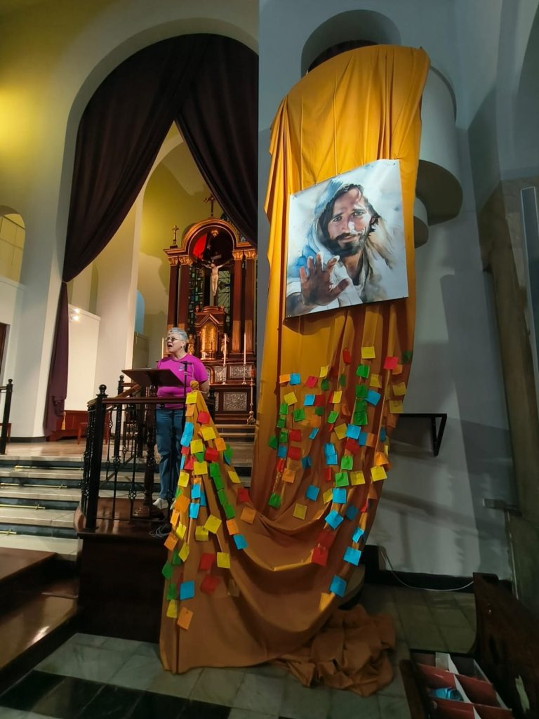 Los asistentes se dividieron en tres grupos que fueron pasando por cada uno de los talleres. Como puesta en común, antes de la celebración de la Eucaristía, a cada uno de los asistentes se nos invitó a trabar el papelito que nos entregaron en el taller correspondiente a familia y catequesis con el alfiler, en la tela colocada al lado del altar, a los pies de una imagen de Jesús con las manos extendidas, como signo de nuestra misión como catequistas.